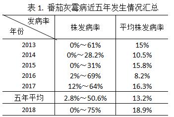 今年番茄灰霉病始见期2017年12月中旬,与去年发生时期相同,株发病率0%~75%,平均病株率18.9%。今年总体病情比去年和近五年同期偏重。详见表1。