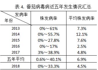 全市番茄病毒病始见期2017年12月中旬,当前株发病率为0%~33.3%,平均病株率为4.5%。今年病情比去年同期略偏轻,比近五年同期偏轻。见表4。