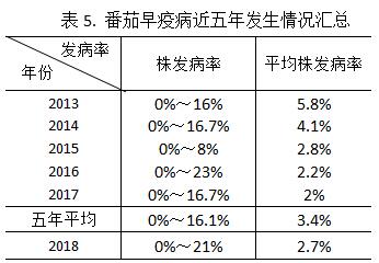 番茄早疫病株始见期2018年1月13日,比去年同期晚23天。当前发病率为0%~21%,平均病株率为2.7%。比去年同期略偏重,比近五年同期偏轻。见表5。