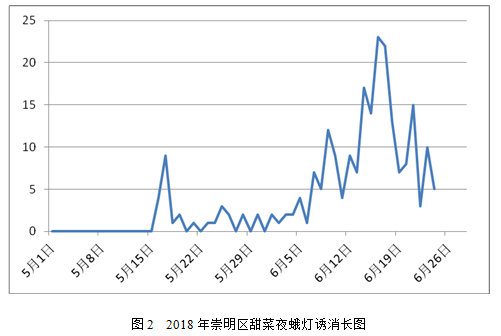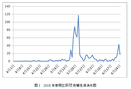 2.1.1 灯诱:截止到6月25日,全市11个测报点平均诱测成虫52.4头,比2017年(48头)增多9.2%,比近五年同期(51.4头)增加2%,其中,奉贤北港测报点灯诱成虫量高达92头。综合全市测报点数据,主要峰期集中在6月6日~6月13日和6月20日~6月24日(二代主峰期),诱蛾量分别高达70头和73头,各占总蛾峰量的32.1%和33.5%。