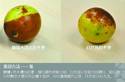 “一看”,看冬枣红色部分的纹路,如果和青色的部分“泾渭分明”,呈现很明显的线状,那很可能就是泡过糖精钠水的。因为染色时,冬枣浮于水面上,蘸到水的部位变红,没有沾到的部位就不会变色。捞上来过夜后,即可呈现出一片片的鲜亮红色。而自然成熟的冬枣,一定是有由青到红的渐变色或斑状纹路存在。