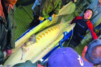 该条全长3.45米、重308公斤的巨型中华鲟是在3月8日在长江口误捕“落网”的,这是迄今为止中华鲟管理处发现的最长也是最重的一条中华鲟。刚被救起时,该中华鲟体表有多处老伤,鳍部多处撕裂,腮部被网具捏伤。专家估计,该中华鲟可能是被网具拉伤过,被过往船只擦伤过。之后它被运送到嘉定临时基地重症监护室进行救治,期间主要通过注射维生素、消炎药和补充能量来增强体能。