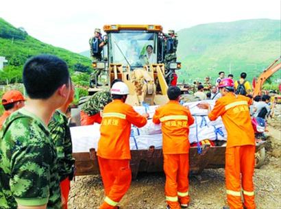 此前的强震将龙泉河桥震垮,双向交通完全阻断。记者在现场看到,每当新一批救灾物资到达,全需靠铲车运往河边,救援官兵再肩挑背扛趟水过河。现场指挥人员告诉记者,目前救援面临的一个难题是油料紧缺。有60人遇难的龙头山镇光明村与外界连通的公路已修复完毕,但地震发生至今救援物资还难以进入,当地村民还没领到救灾帐篷,下午下雨时,当地村民只能躲在自己搭建的简易帐篷中等待。