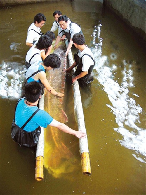 近年来,频有野生中华鲟受伤。图为2007年专家救助在长江口受伤的大型中华鲟