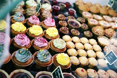 图片说明:漂亮的杯子蛋糕摆了满满一柜台。