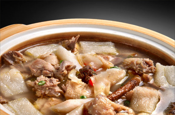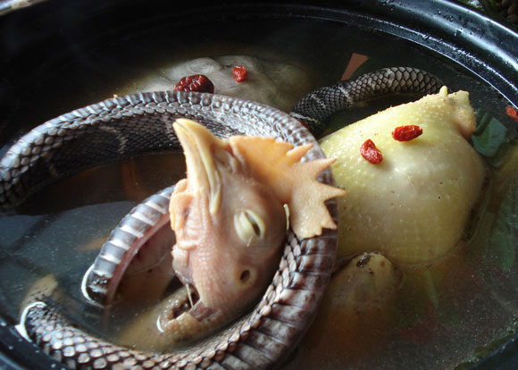 原料:蛇肉150g,鸡脯肉、冬笋各100g,火腿20g。鸡汤1000g,姜片、料酒香油、精盐、味精、胡椒粉各适量。
