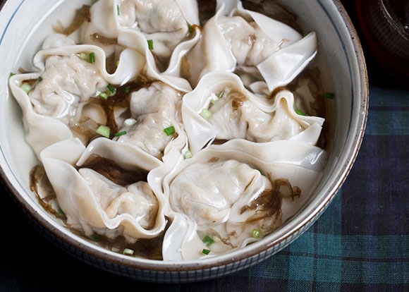 “馄饨拜冬”是北方的冬至食俗,所谓“冬至馄饨夏至面”。之所以选用馄饨拜冬,是因为“馄饨之形有如鸡卵,颇似天地混沌之象,故于冬至日食之。”全国各地对于馄饨又有不同称呼,如广东称云吞,江西称清汤,四川称抄手。在做法与形状上都有一定区别。譬如广东以整只虾仁为馅,吃时也会以面条相佐;江南一带则多在汤底中加入芝麻油、小虾米或榨菜丝,巴蜀地区则少不了红香辣油。相较水饺,馄饨普遍体小而皮薄,各种丰富汤料更是不可或缺的重要角色,吃起来汤水皮馅浑然一体,反倒有说不出的熨帖顺畅。此外又有煎馄饨、蒸馄饨等。