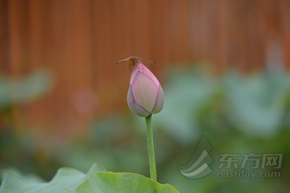 图为一只蜻蜓正落在一朵含苞待放的荷花上休息。
