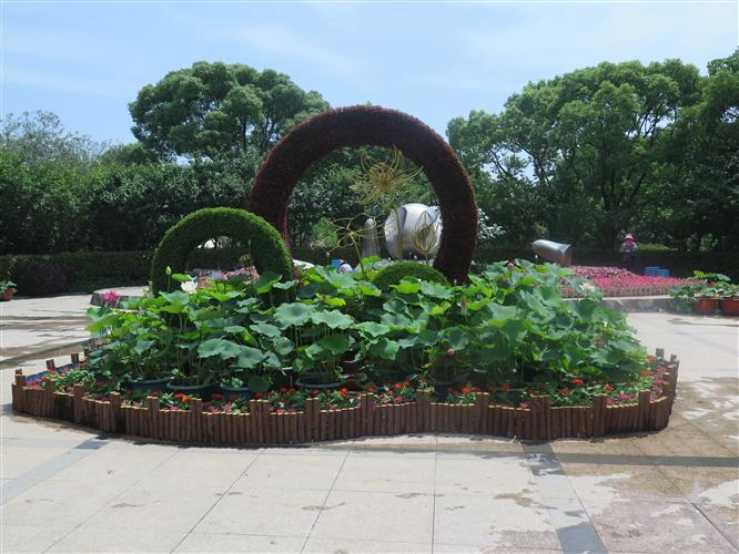 公园西大门,一处精美的立体组合荷花景点呈现在了游客的眼前,两侧布置了十多种色彩丰富、花型各异的精品荷花和睡莲,有秣陵秋色、金陵畅想、珠峰翠影、睡美人、逸仙莲等品种。沿着公园左侧道路至银杏大道,200多盆各色缸栽荷花布置在路旁,直至人工湖亲水平台等区域。在银杏大道南北两端,两处各具特色的园林小景,点缀着栩栩如生的动物摆件,更增添了一抹俏皮灵动的气息,与塘栽荷花遥相呼应形成“一步一景”的园艺布局。