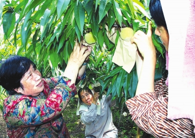 为推行最优品种、最好品质、最响品牌的“三品”战略,浦东新区农委通过优质资源整合全力打造南汇水蜜桃,并于今年2月组建了由上海桃源科技发展有限公司、上海申凤桃业专业合作社及上海桃咏桃业专业合作社等多家优质产业主体强强联手的非法人性质的南汇水蜜桃品牌合作联社,实行统一技术、统一标准、统一质量、统一商标、统一包装、统一价格。目前,该联社基地种植面积4000亩,带动生产面积10000亩。图为合作联社成员之一的上海申凤桃业专业合作社创始人、南汇“国家级水蜜桃标准化示范基地”打造者王凤娟(左)在品牌桃种植基地观察桃子生长情况。