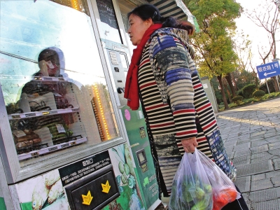 图为设在桃浦地区已有一年多时间的强丰第三代无人售菜机,成为当地“马大嫂”走过路过时候的“目光停留点”。