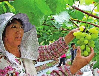 ■“圣泉”合作社人员正在采收今年最后一茬荣获市金奖与全国优质奖的“黄蜜”葡萄。