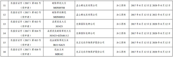 此次批准的16个转基因生物安全证书(进口)中,涉及到的转基因生物为大豆、玉米、油菜、棉花、甜菜,用途皆为“加工原料”。此外,获得证书的公司有孟山都、拜耳、陶氏益农、先锋国际、先正达,证书有效期都为3年,即2017年6月12日至2020年6月12日。