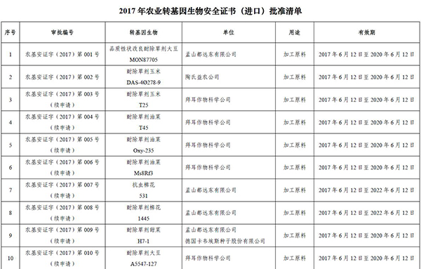 6月14日,澎湃新闻(www.thepaper.cn)从农业部网站获悉,中国农业部发布2017年转基因生物安全证书进口清单,批准孟山都、拜耳 、先正达等公司的大豆玉米等部分产品。