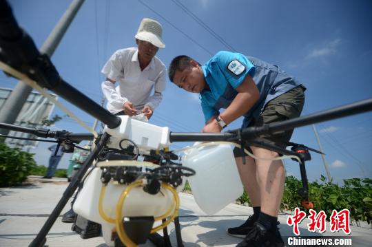 图为农用植保“无人机”操作员做稻田喷洒农药准备工作。 孟德龙 摄