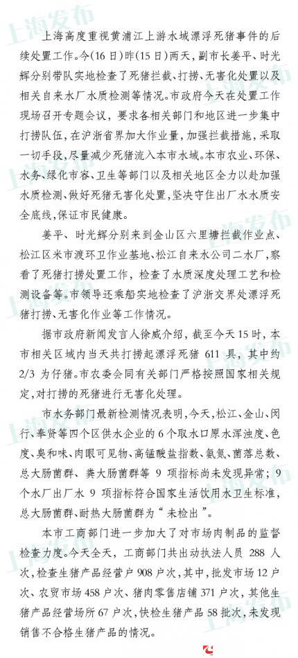 截至今天15时,本市相关区域内新打捞起漂浮死猪611具。市政府要求进一步集中打捞队伍,在沪浙省界加大作业量,加强拦截措施,采取一切手段,尽量减少死猪流入本市水域;全力以赴加强水质检测、做好死猪无害化处置、做好市场肉制品监督检查。