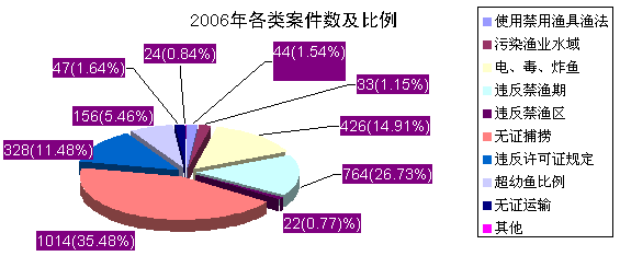 3、违反禁渔期捕捞案件增幅明显、危害较大,违反禁渔期规定捕捞案件主要表现为违反内陆禁渔期规定进行捕捞,2006年2月至5月全市共查处此类案件723起,各区(县)渔政站要进一步加强禁渔期间的巡航检查,降低违反禁渔期规定进行捕捞行为的发生频率,切实保护渔业资源,确保渔业资源增殖放流成果。