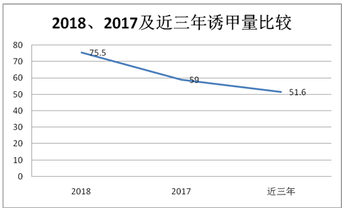 2.2.2诱甲量 截止今年4月18日,6个测报点黄盆诱甲量单盆累计平均为75.5头,青浦高达254头。2017年同期为59头,近三年同期平均为51.6头,今年当前诱甲量高于去年28%,高于近三年同期46%。全市黄条跳甲始峰期出现在3月初(3月3日~5日),比往年偏早,主峰出现在三月初(3月3日~3月5日),诱甲量占总峰量的43.3%。