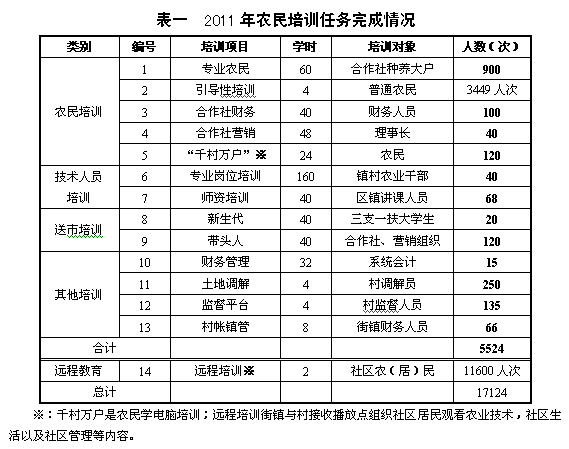 今年的培训项目是最多的,有十三项,主要原因是:市、区农委对农业组织的重视,国资委的经管站和集资办并入区农委系统,加强对惠农资金的监管等。从农民培训的内容来看,农民培训已经贯穿农业产业链的全部,从生产到加工、营销,并从第一产业延伸到第三产业;培训方法采用课堂讲解与现场观摩相结合,专家讲课与学员交流相结合,请进来与走出去相结合,有的送到北京、上海培训,有的集中到本中心培训,有的在街镇参加培训。2011年本区农民培训增加了“农村集体资产管理培训”、“农村土地纠纷调解员培训”、“惠农资金监管平台培训”等。全年培训人次达到5524人(次),其中专业农民培训900人,合作社培训140人(财务人员100人,营销员40人),实用技术(引导性)培训3650人次,农民信息(应用篇)培训120人,师资培训68人,岗位培训40人,农村土地纠纷调解员培训250人,村帐镇管财务人员65人,惠农资金监管平台人员135人,送上海农业院校、农科院培训140人(合作社理事长120人,三支一扶大学生20人),超过年初计划的各项指标。