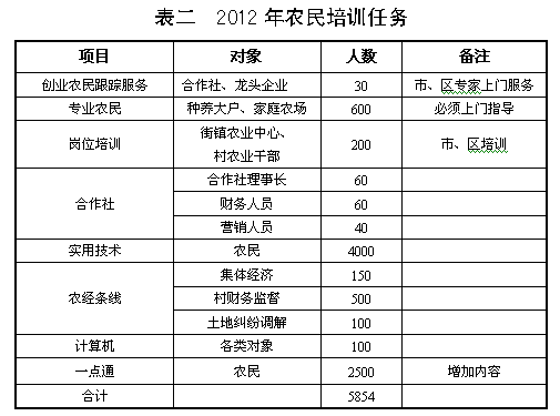 根据本区实际,2012年培训规模为5800人次,其中专业农民培训600人(培训3天,上门指导任务完成2400次),实用技术培训4000人次(培训1天,或者现场指导1次),合作社培训190人,“一点通”培训2500人次(主要对象是农民),集体经济管理650人(见表三)。实现“稳定农民培训规模,鼓励开展实用技术培训,积极推进合作社培训,全面提高培训效果”的总体目标。