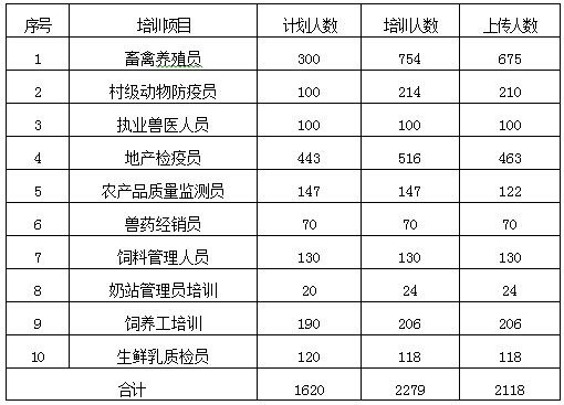 今年本培训基地计划完成1620人的培训任务,实际完成2118人,完成率为131%(见下表),并已将各个培训班级的资料及时上传到上海农村远程教育平台。培训人员主要包括畜禽养殖员、兽药经销员、饲料管理员、农产品质量监测员、村级动物防疫员、乡村兽医、地产检疫员、奶站管理员、生鲜乳质检员、饲养工等10大类。在培训的过程中,将部分班级的培训与国家职业技能鉴定相结合,开展了动物疫病防治员、家畜(禽)饲养工、家畜(禽)繁殖工等职业工种共7批,361人的职业技能鉴定。